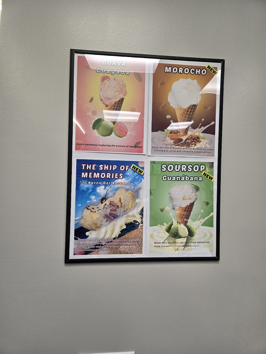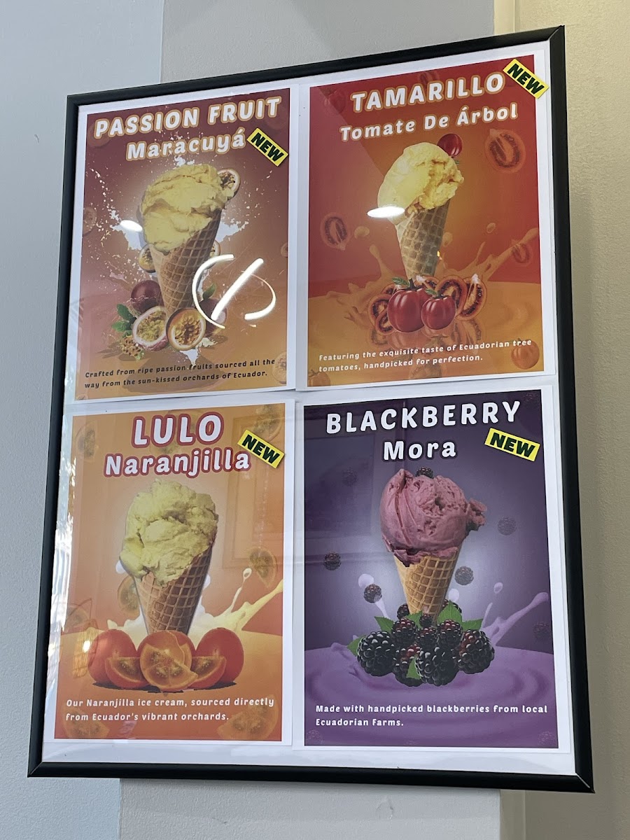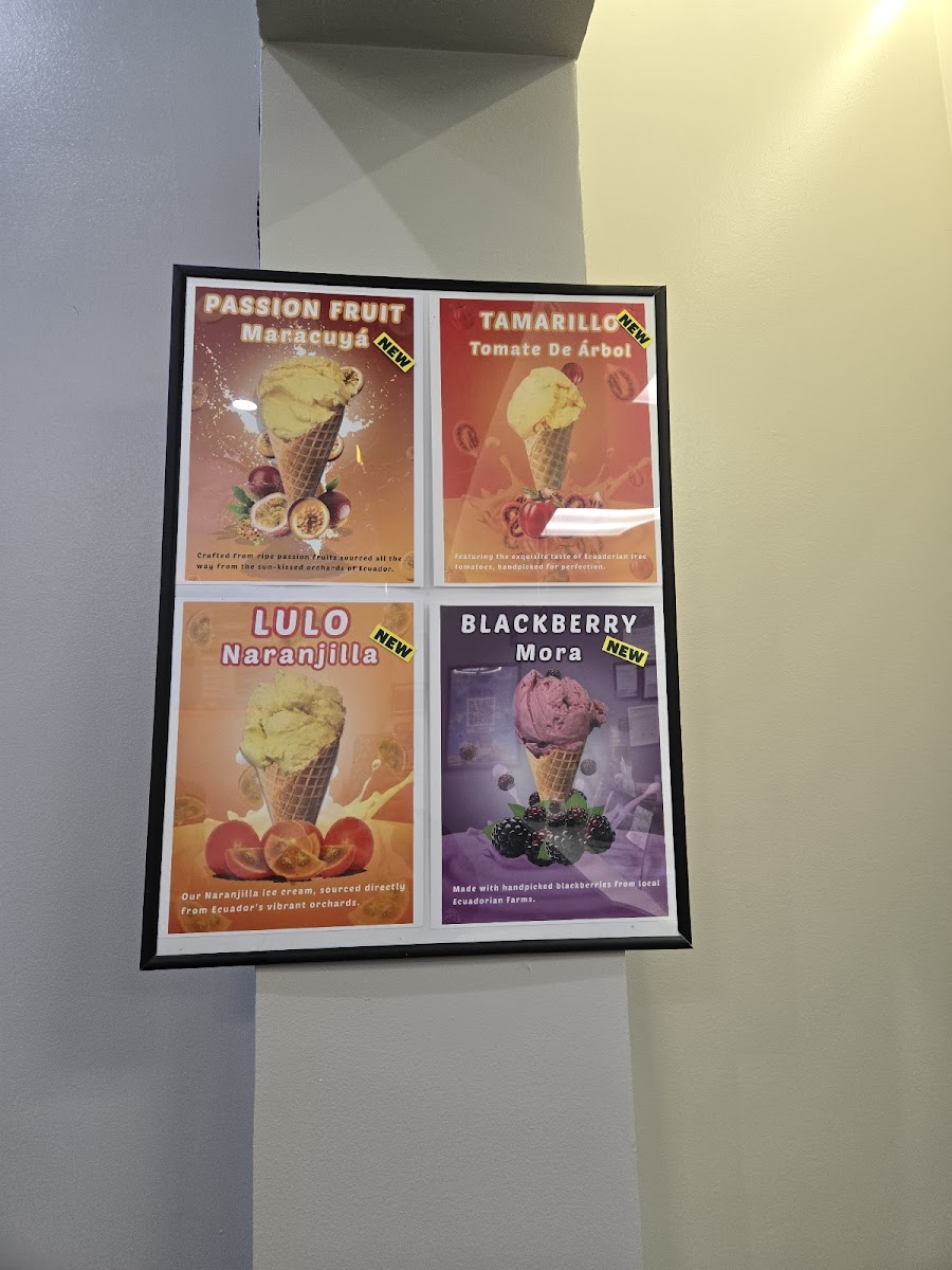 The menu features a thoughtful selection of ice creams and yogurts inspired by Ecuadorian ingredients, such as soursop, passion fruit, and guava, which provide a fresh, lightly exotic twist to classic treats. Alongside these, familiar favorites like cappuccinos, iced coffee, and rich hot chocolate keep things cozy and approachable.